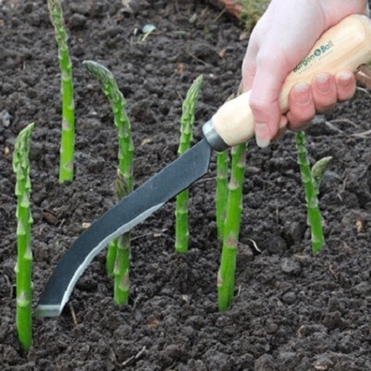 Met dit mes combineer je de twee populairste methoden van het aspergesnijden. Het gekartelde lemmet zaagt de stengel moeiteloos door onder het grondoppervlak. De scherpe punt zorgt er daarna voor dat de asperge gemakkelijk geoogst kan worden.