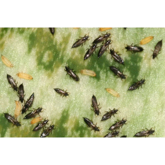 De trips kan vliegen, waardoor hij zich razendsnel kan verplaatsen en ook de plaag zich snel verspreid. De trips is een klein dun insect, met een breedte van bijna 1 mm. De vleugels zijn bijna transparant. Deze kleine insecten (minder dan 1 mm breed) voeden zich door in de cel van het blad te prikken om vervolgens de inhoud op te zuigen. Je zult dit zien doordat bladeren zilverachtige vlekken tonen met daarop kleine donkergroene vlekjes. Wanneer bladeren extreem zijn aangetast, zullen ze bladeren zelfs verdrogen. De volwassen trips verpopt zich in de bodem onder de plant en zal zich daarna weer verplaatsen naar de plant. Vervolgens legt de trips zijn eitjes weer in de plant, waardoor er nieuwe larven ontstaan. De larven van de trips zijn uitstekend te bestrijden met aaltjes.